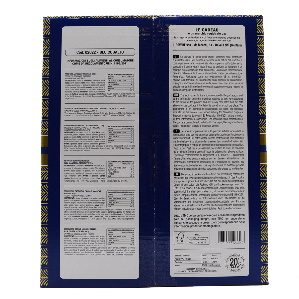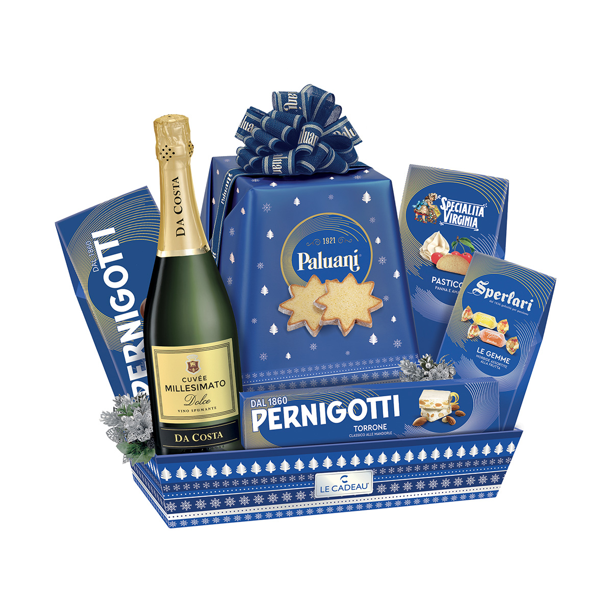 | Denominazione: | Vassoio serigrafato Paluani pandoro 500g Da Costa spumante millesimato dolce 0,75l Pernigotti torrone morbido alla mandorla 75g Pernigotti gemme al latte 75g Virginia pasticcini panna e amarena 80g Sperlari gemme morbide gelées alla frutta 100g |