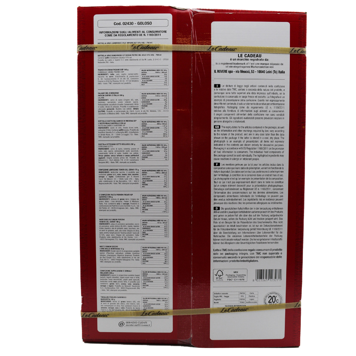 Effettuare login per visualizzare prezzi ed effettuare ordini| Denominazione: | Vassoio serigrafato Pietre del Sole sangiovese Igt 0,75l Contri Villa Annone lambrusco Igt 0,75l Grana Padano Dop 140g Antichi Sapori d’Italia salame del contadino 100g L’Aceto Reale aceto balsamico di Modena Igp 250ml Bellucci cotechino cotto 250g Tenuta del Cervo lenticchie 175g Garofalo n.2 confezioni pasta pennoni rigati 250g Tenuta del Cervo sugo ai funghi porcini 190g Tenuta del Cervo misto funghi secchi 15g Antichi Sapori zuppa legumi e cereali 200g Margiotta tarallini classic |
