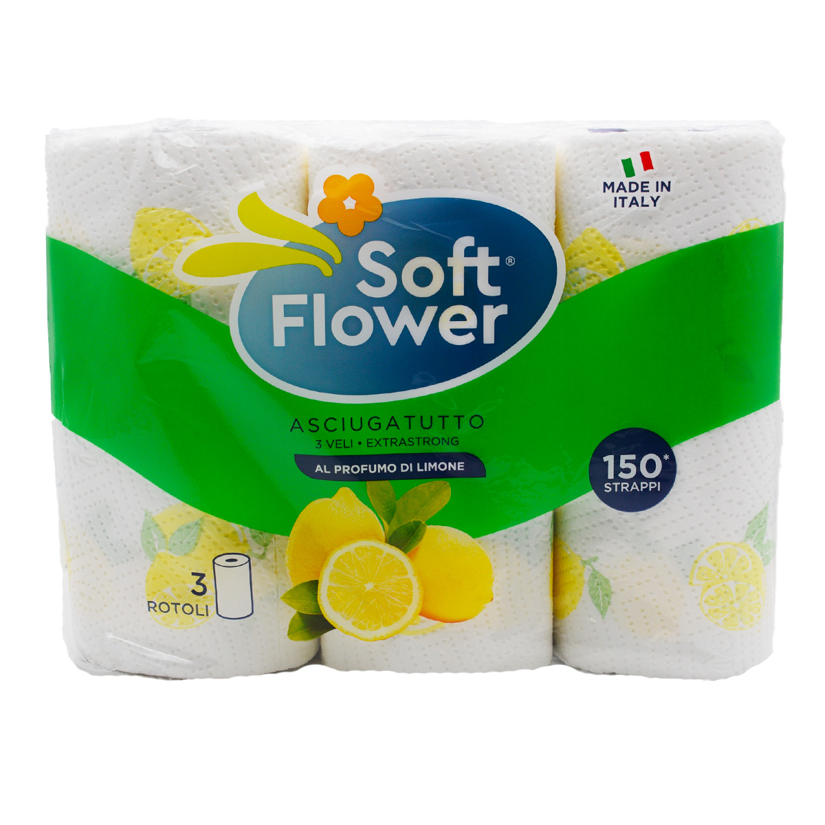 Soft Flower Asciugatutto 150 Strappi, 3 Veli, 3 Rotoli, Limone