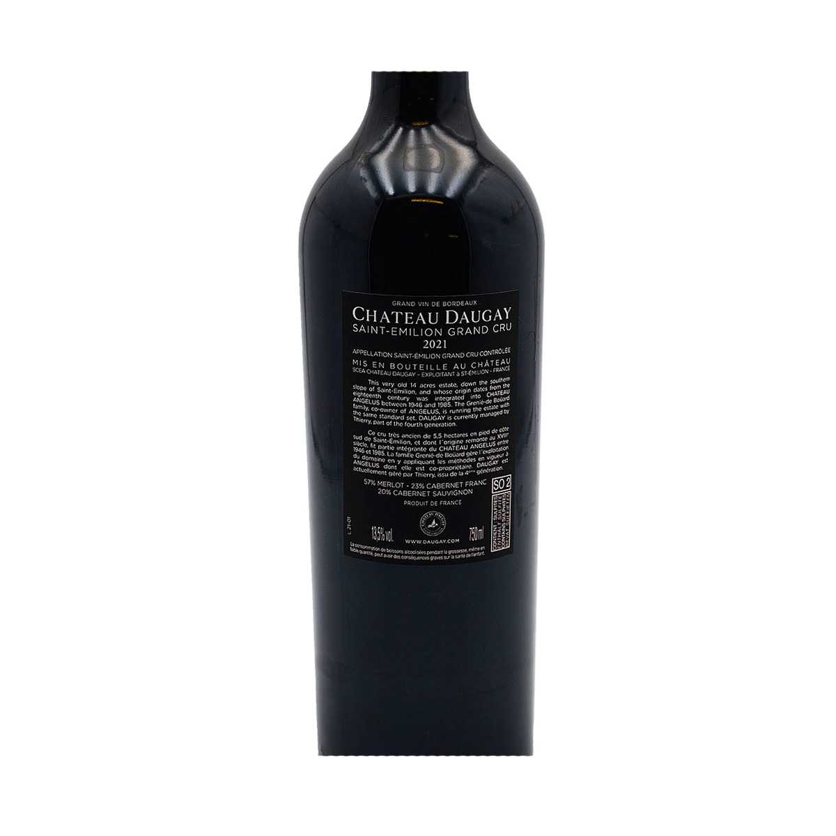 Effettuare login per visualizzare prezzi ed effettuare ordiniRosso rubino con rilfessi granati, al naso sprigiona uno straordinario bouquet aromatico. Al palato è elegante molto equilibrato e puro.; Annata: 2021; Vitigno: Merlot, Cabernet; Produttore: Chateau Daugay; Paese: FRANCIA;
