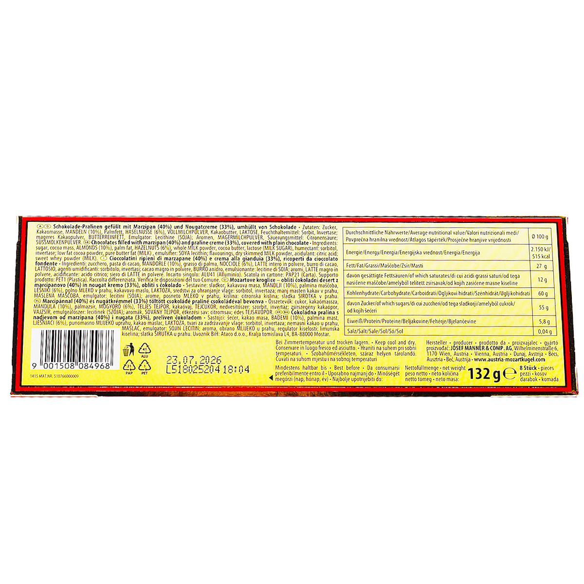Mozart Austria, Cioccolatini Ripieni di Marzapane e Crema alla Gianduia 132g