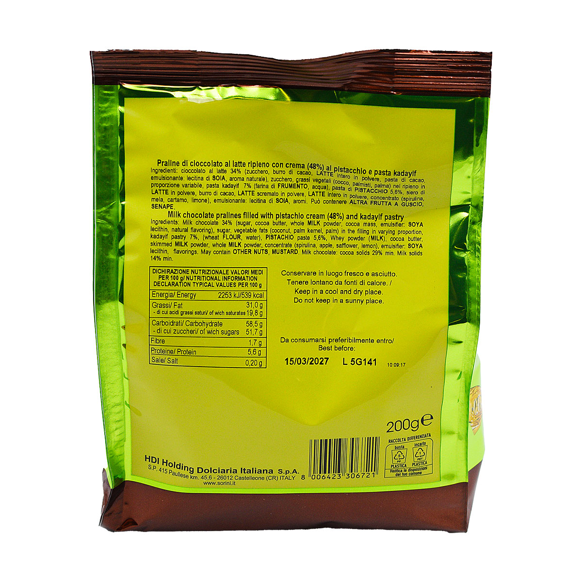 Sorini Praline di Cioccolato al Latte Ripiene di Crema al Pistacchio e Pasta Kadayif 200g