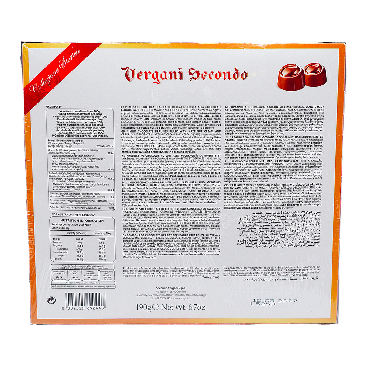 Vergani Praline Cioccolato al latte Ripiene con Crema alla Nocciola e Cereali 190g