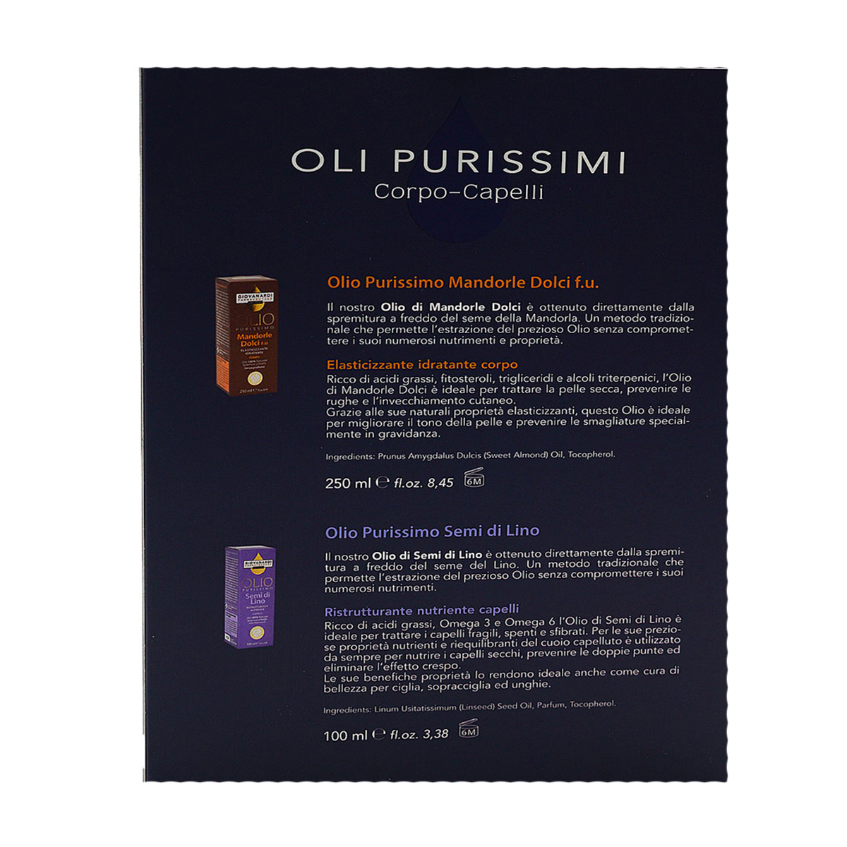 | Denominazione: | Olio Purissimo Mandorle Dolci 250ml Olio Purissimi Semi di Lino 100ml |