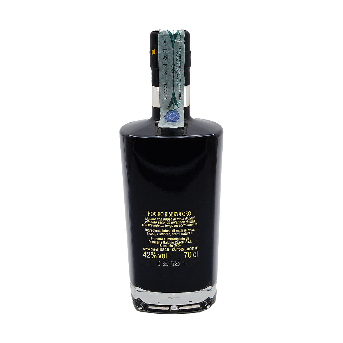 Nocino ottenuto con infusi di malli di noci, secondo un'antica ricetta che prevede un lungo invecchiamento.;