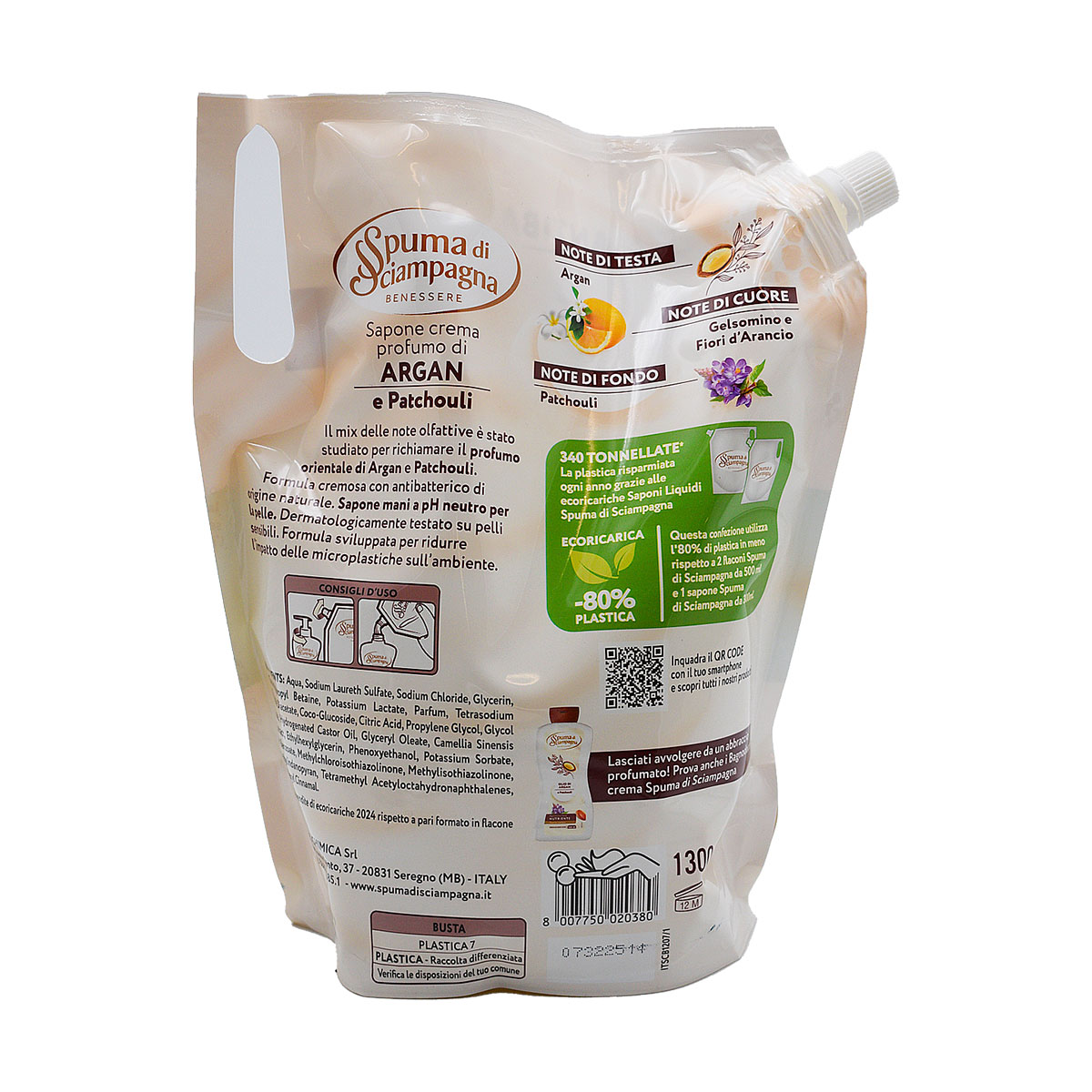 Spuma di Sciampagna Ecoricarica, Sapone Mani Argan e Patchouli con Antibatterico 1300ml