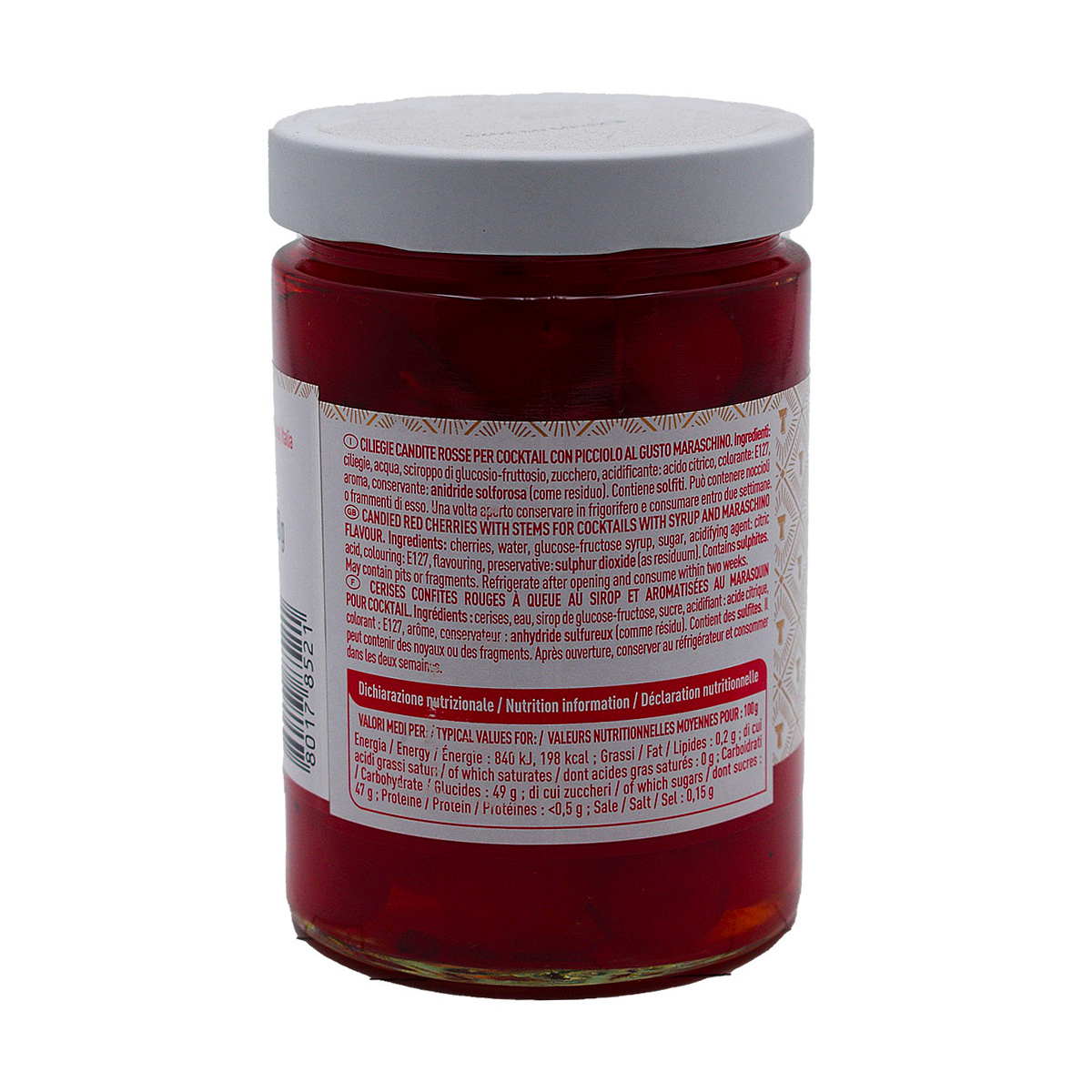 | Denominazione: | Le ciliegie rosse della linea cocktail cherries Toschi sono ideali per decorare e dare un tocco di colore e sapore a tutti i Drink. Le ciliegie rosse Toschi sono sciroppate e aromatizzate al maraschino, e conservate con il proprio picciolo. |