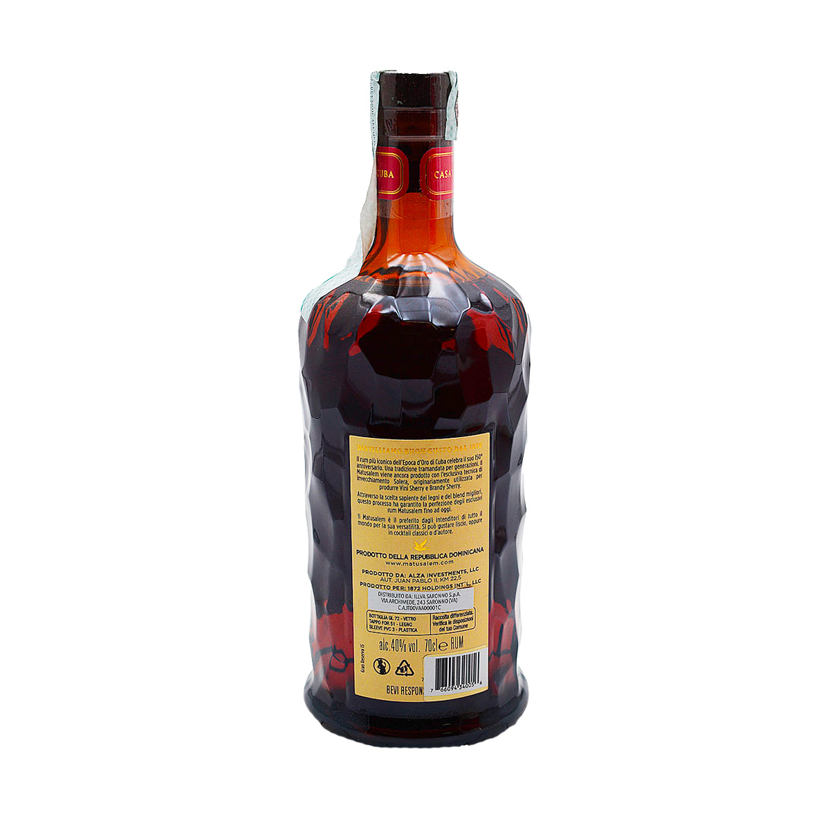 | Denominazione: | Rum Gran Reserva 15 Anni è prodotto dalla melassa della canna da zucchero distillata e poi invecchiata per un periodo di tempo che va dai 15 ai 23 anni, tramite il celebre Metodo Solera. Al naso emergono note di vaniglia, pepe bianco e tabacco. Il colore è mogano chiaro. |